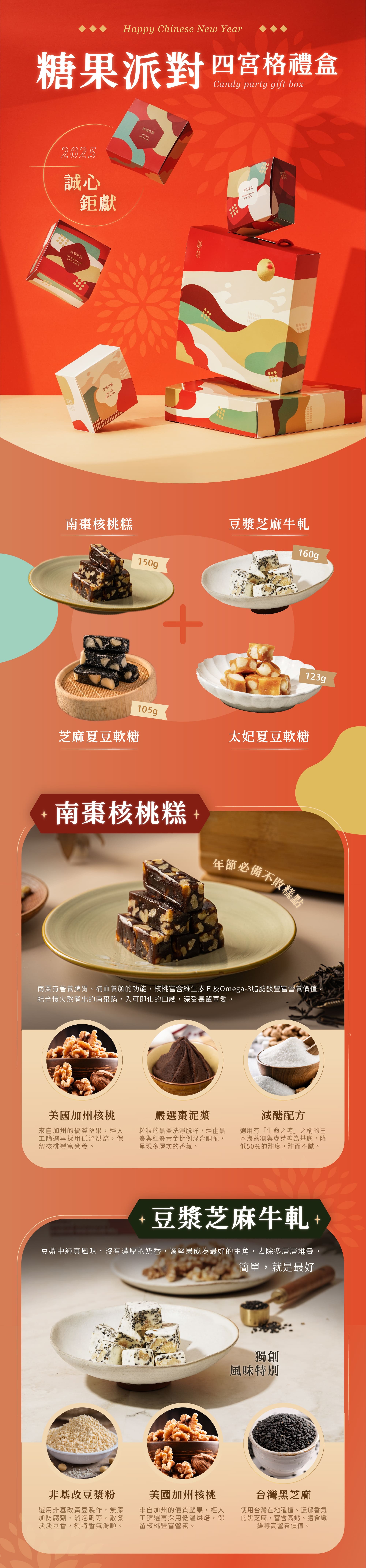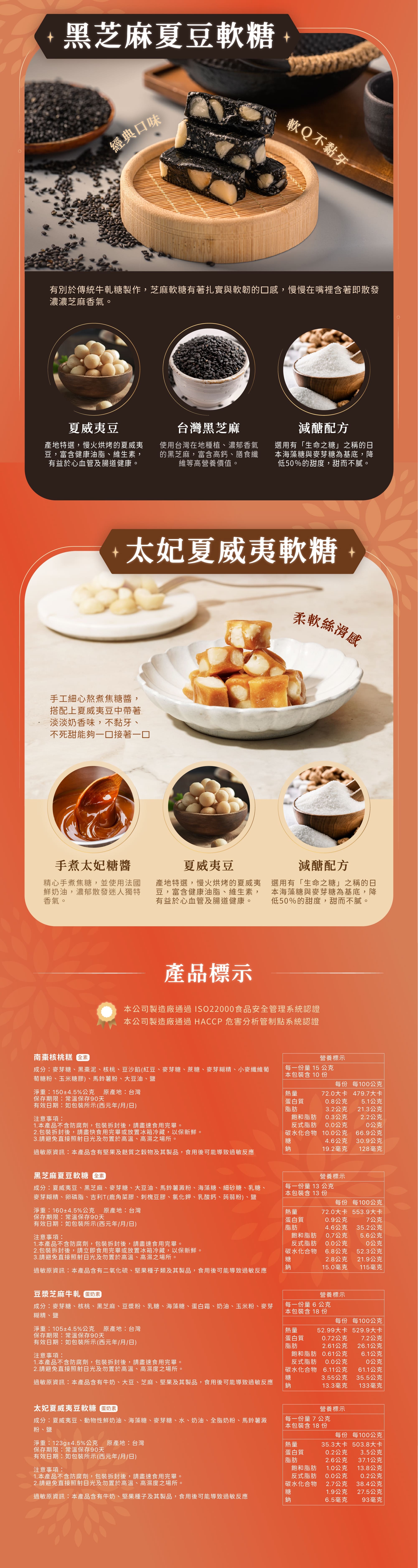 內容物:南棗核桃糕+黑芝麻夏豆軟糖+豆漿芝麻牛軋+太妃夏威夷豆軟糖